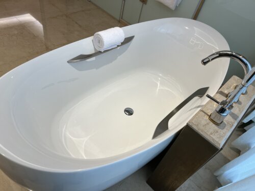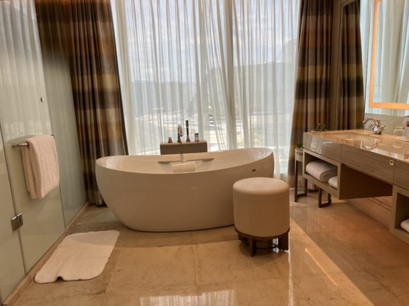 鏡に映る自分の姿は、まるで映画のワンシーンのよう。ラグジュアリーと静寂が共鳴するこの空間で、ただひとり、贅沢な孤独を味わう。都市の喧騒も、カジノの煌めきも、今はすべて遠く。あるのは、湯とワインと、心地よい沈黙だけ。