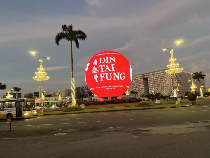 夕暮れの空に浮かぶ真紅の球体が、まるで都市の心臓のように輝いている。SMモール・オブ・アジアのランドマークとして、DIN TAI FUNGの文字が堂々と光り、アジアの美食文化を祝福してるみたい。