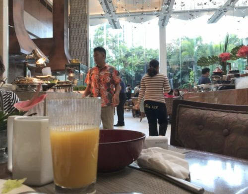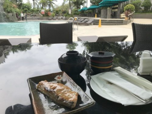 この時はレストランが満員のため、プールサイドで朝食を…