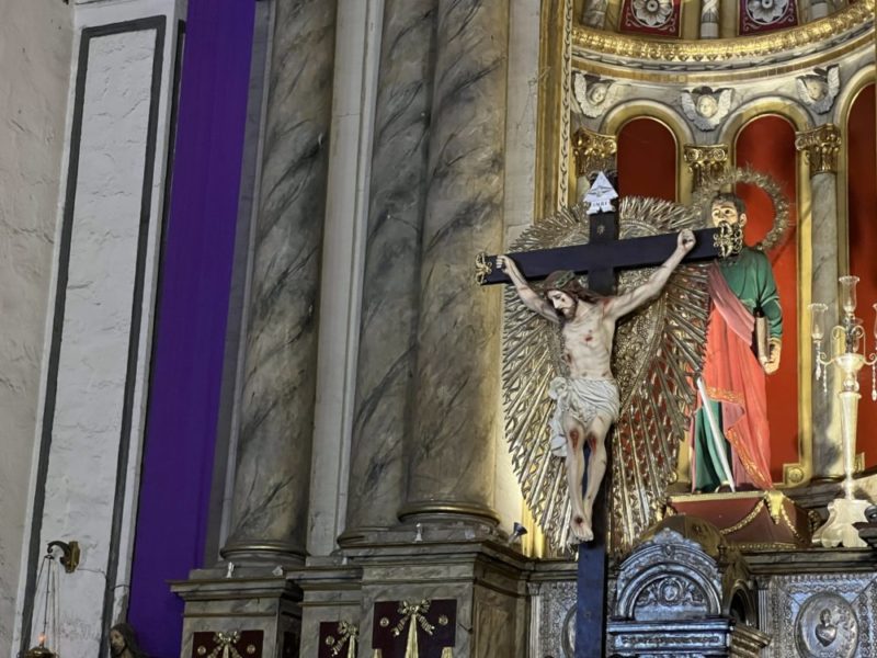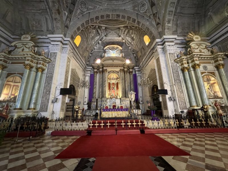 教会の中に足を踏み入れると、そこはまさに別世界。高いヴォールト天井、繊細な彫刻、金色に輝く祭壇、そして紫の布が静かに揺れる空間は、訪れる者の心を自然と祈りへと導きます。