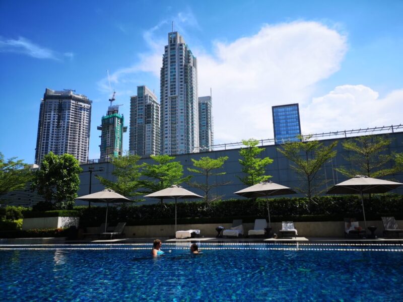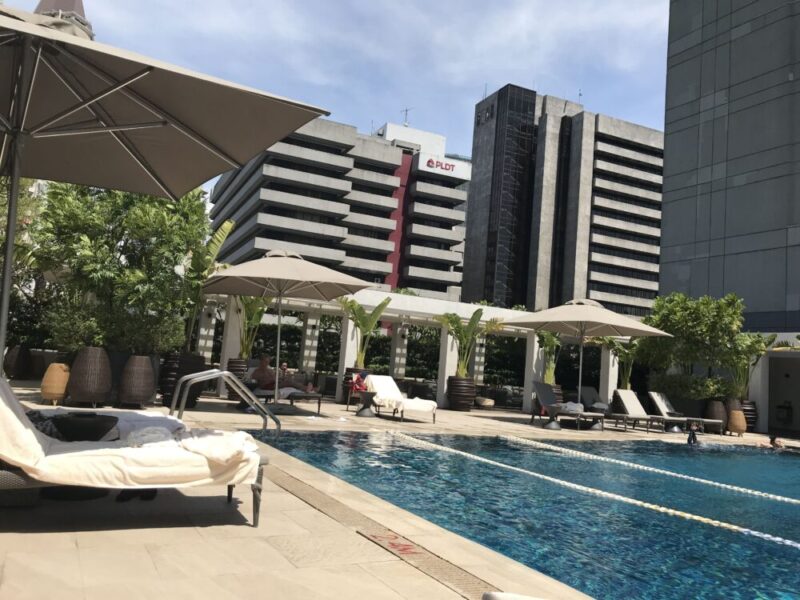 マカティ シャングリ・ラのプールサイドは、まるで都会のオアシス!✨ ここでは高層ビル群に囲まれながら、リゾート感を満喫できます。
