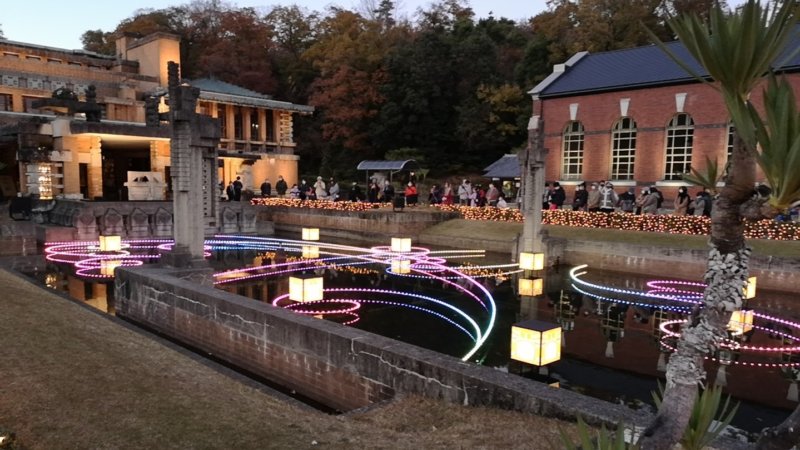 20世紀を代表する建築家フランク・ロイド・ライトが設計した旧帝国ホテルの前で開催されるイルミネーション・ミュージカルショーは圧巻です