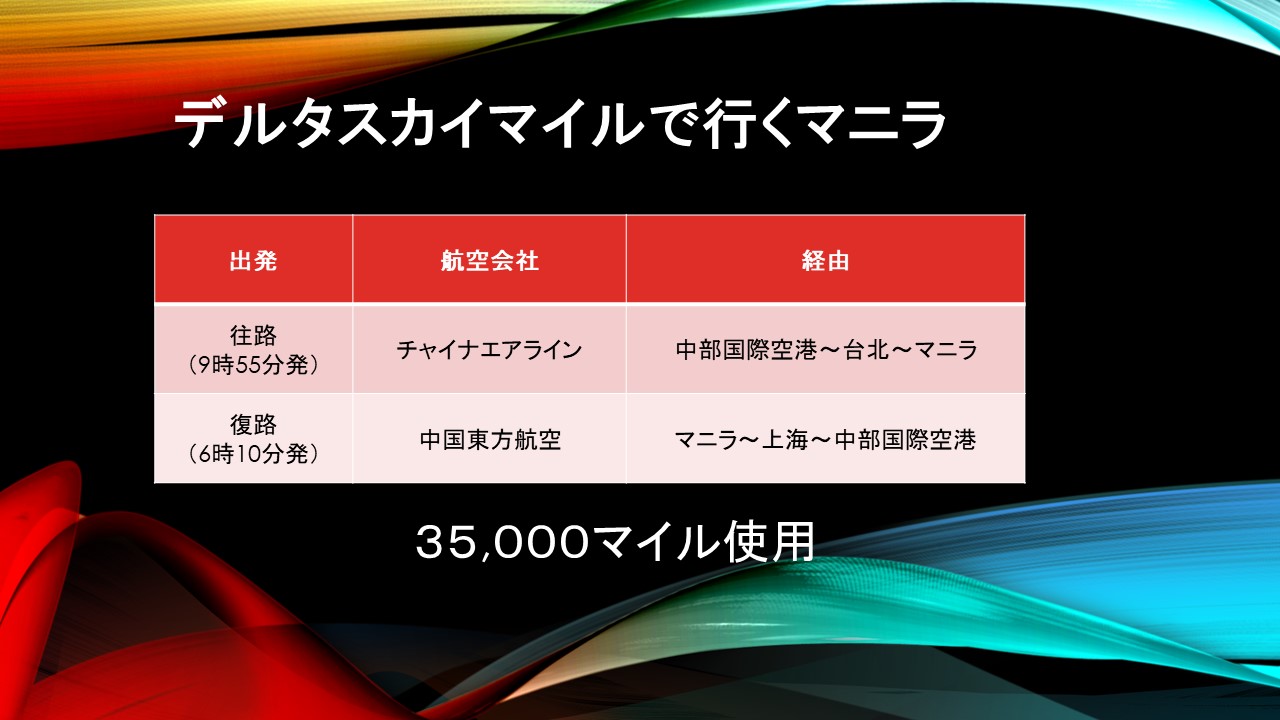 マイルを利用する旅は飛行機の乗る便が変わる。名古屋からマニラまでの直行便はありますがマイルは利用できません。マイルが利用できる中華航空で行くことになりました。