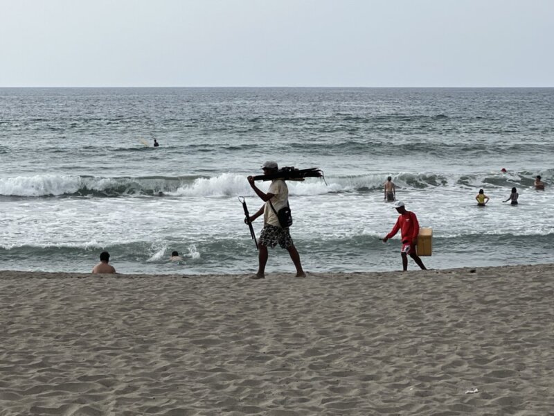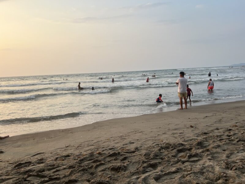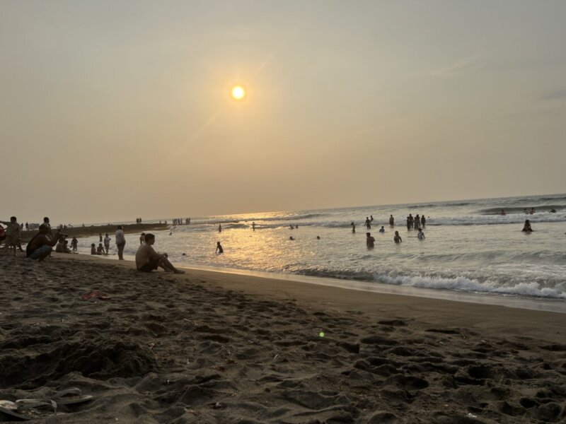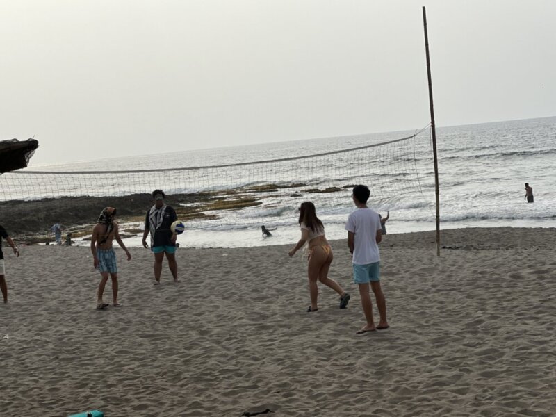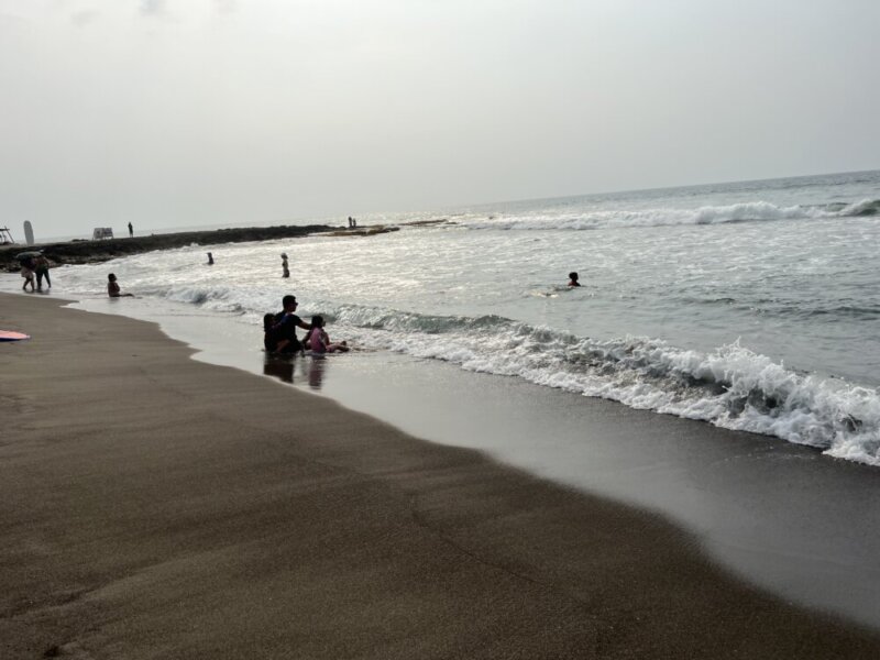 ビーチの雰囲気:広々とした砂浜に沿って、サーフショップ、カフェ、ゲストハウスが並び、リラックスした雰囲気が漂います。