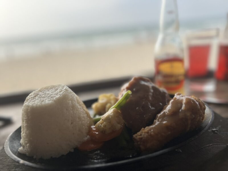 ビーチBARで1人ディナー、サンミゲルアップルに鶏肉の定食が定番スタイル。私はサーフィンはしないが眺めているだけで心が落ち着く。旅の疲れを癒す最高の手段だ。
