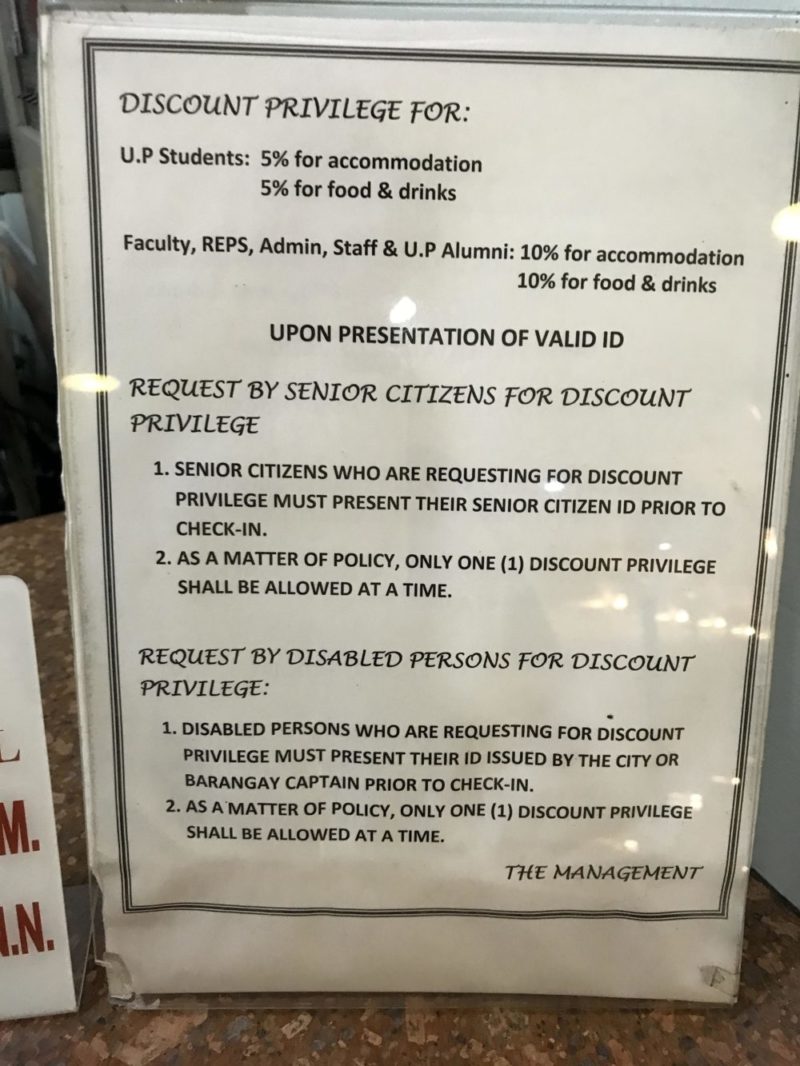 - 割引を希望する障がい者は、チェックイン前に市またはバランガイ長が発行したIDを提示する必要があります。